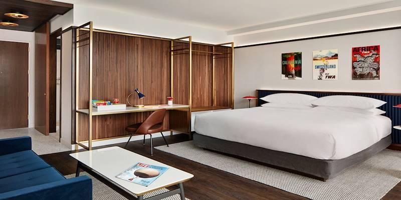 Attached to JFK Airport’s Terminal 5, this hotel brings back the golden age of air travel. Originally designed by Eero Saarinen, the building was once part of the TWA Flight Center. Now it’s been turned into a full hotel, and everything—down to the rotary phones and brass light fixtures—leans into its 1960s identity.